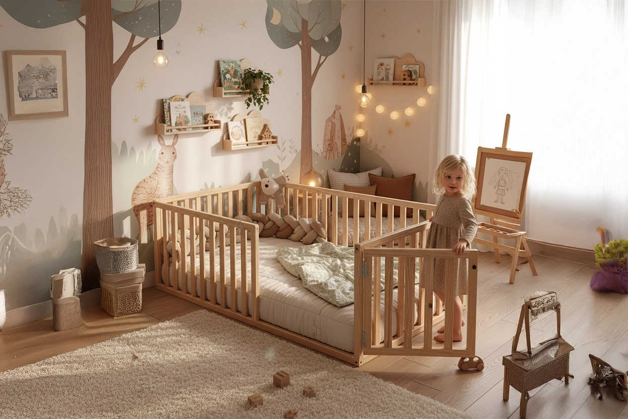 Hug Nova Montessori Toddler Bed | Solid Wood Floor Bed with High Railings and Gate