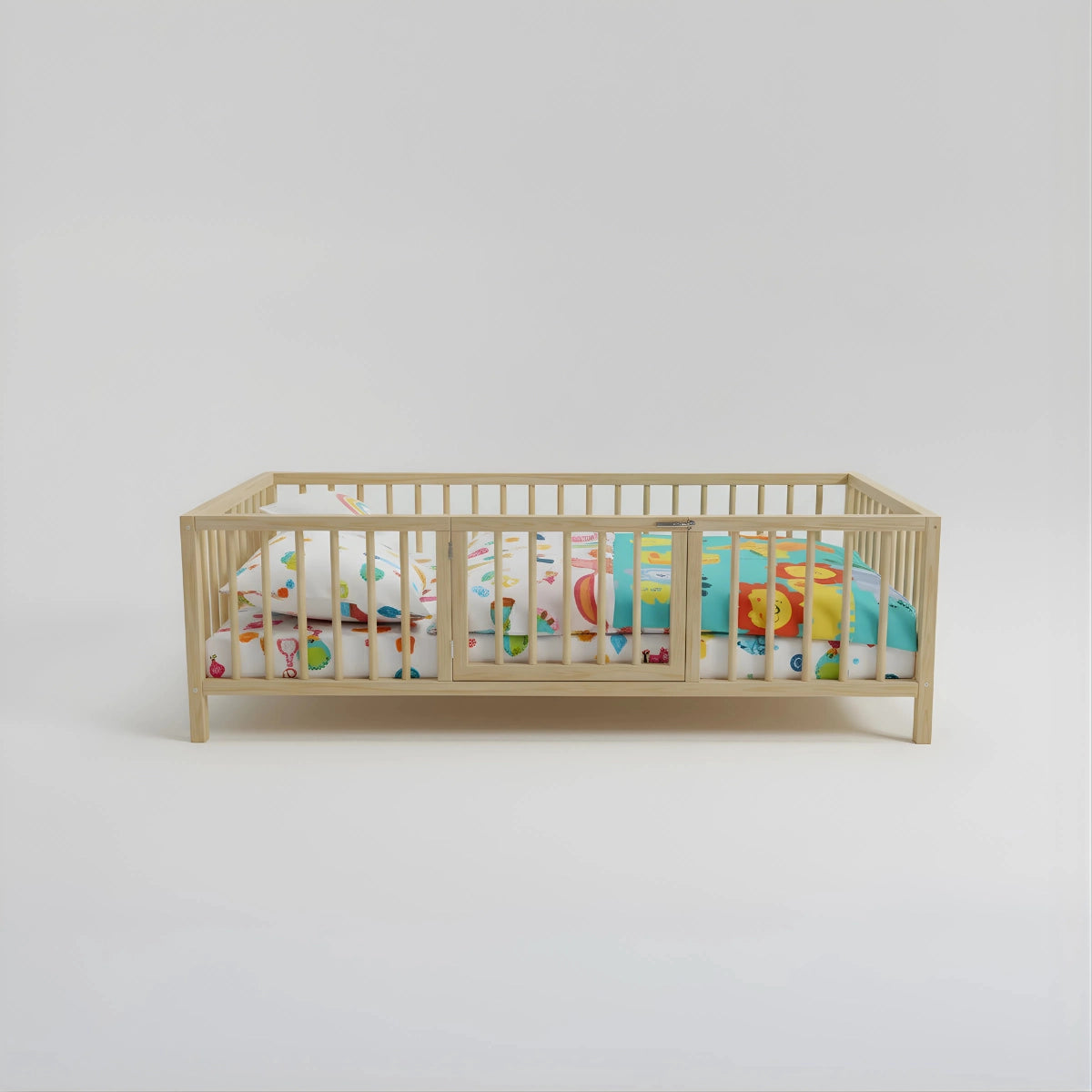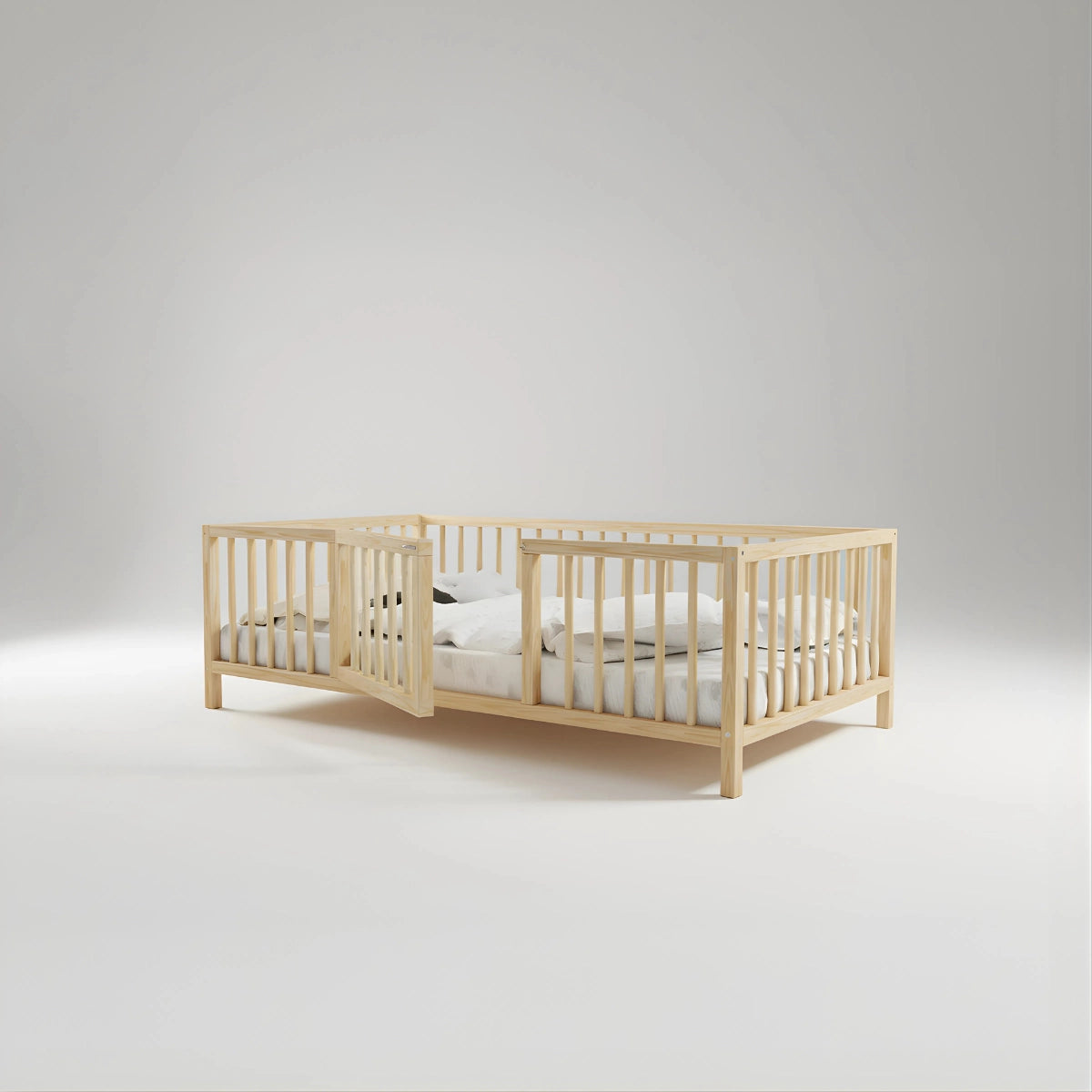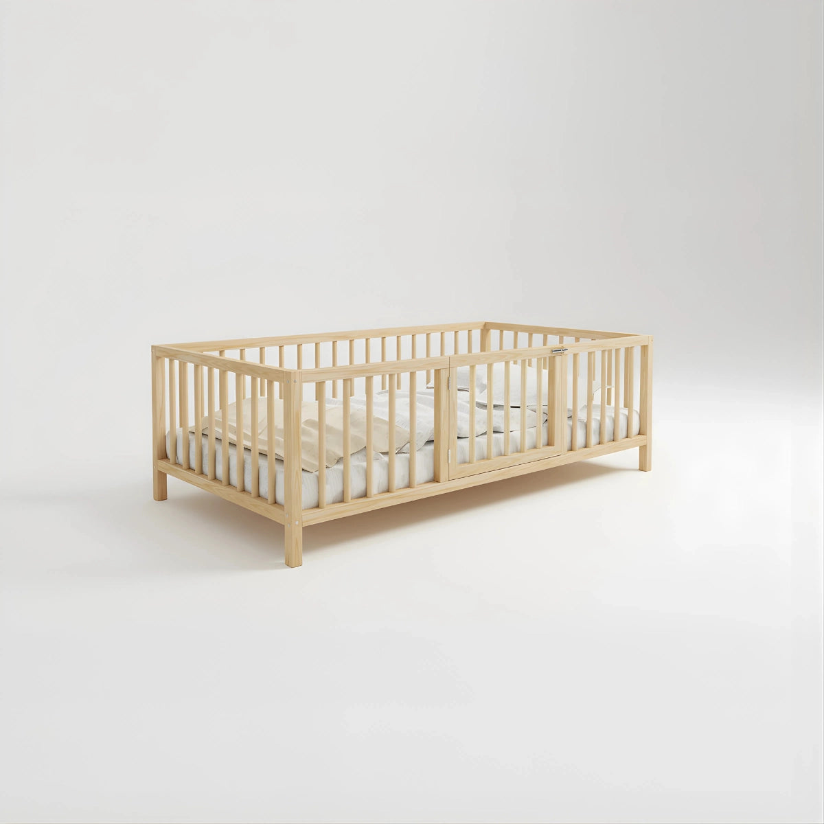 Hug Cove Montessori Toddler Bed | Natural Solid Pine Wood Floor Bed with Rails and Gate