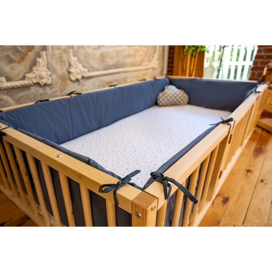 The untreated pine wood exudes a charming, rustic appeal, showcasing the authentic texture and grain of the wood in its purest form. Without the use of polish or varnish, the bed retains its natural scent and texture, creating a connection with nature within the child's sleeping space.